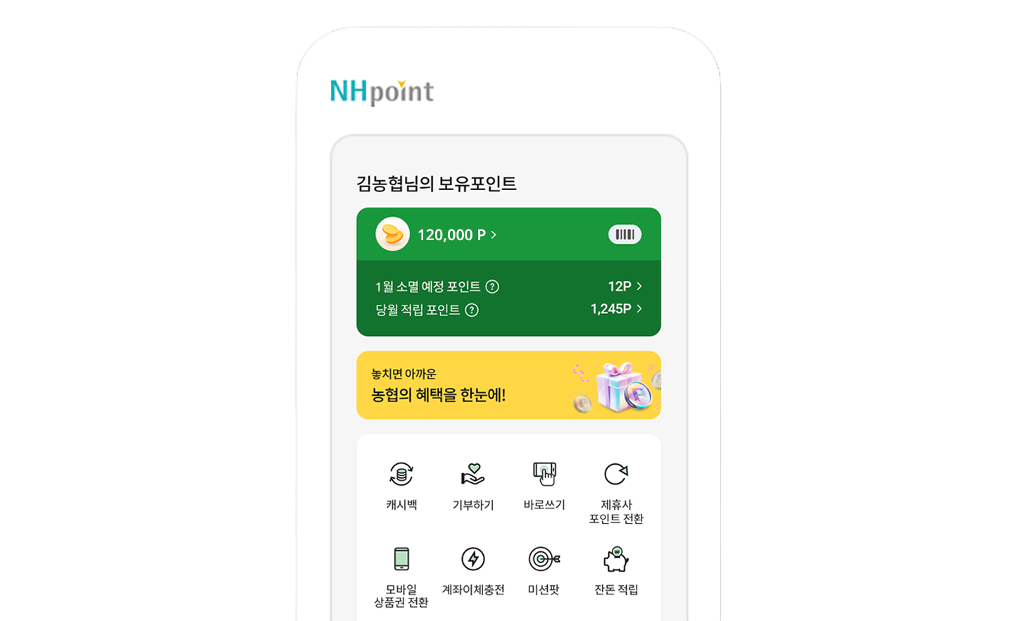 대한민국 금융과 유통 분야를 선도하는 농협 제휴사 및 다양한 NH포인트 외부 가맹점의 서비스와 채널을 멤버십 하나로 자유롭게 이용할 수 있도록 결합한 농협의 통합 멤버십 서비스입니다.